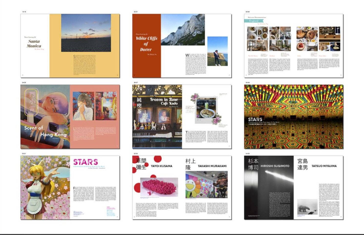 The content, including original writing and photography, was contributed by myself, friends, peers, and carefully sourced online materials. Visually, the magazine is structured using a clean two-column grid system. Typography varies thoughtfully by topic, complemented by a custom-designed typeface crafted specifically for the title “Kaleidoscope,” adding a unique and cohesive identity to the publication.
