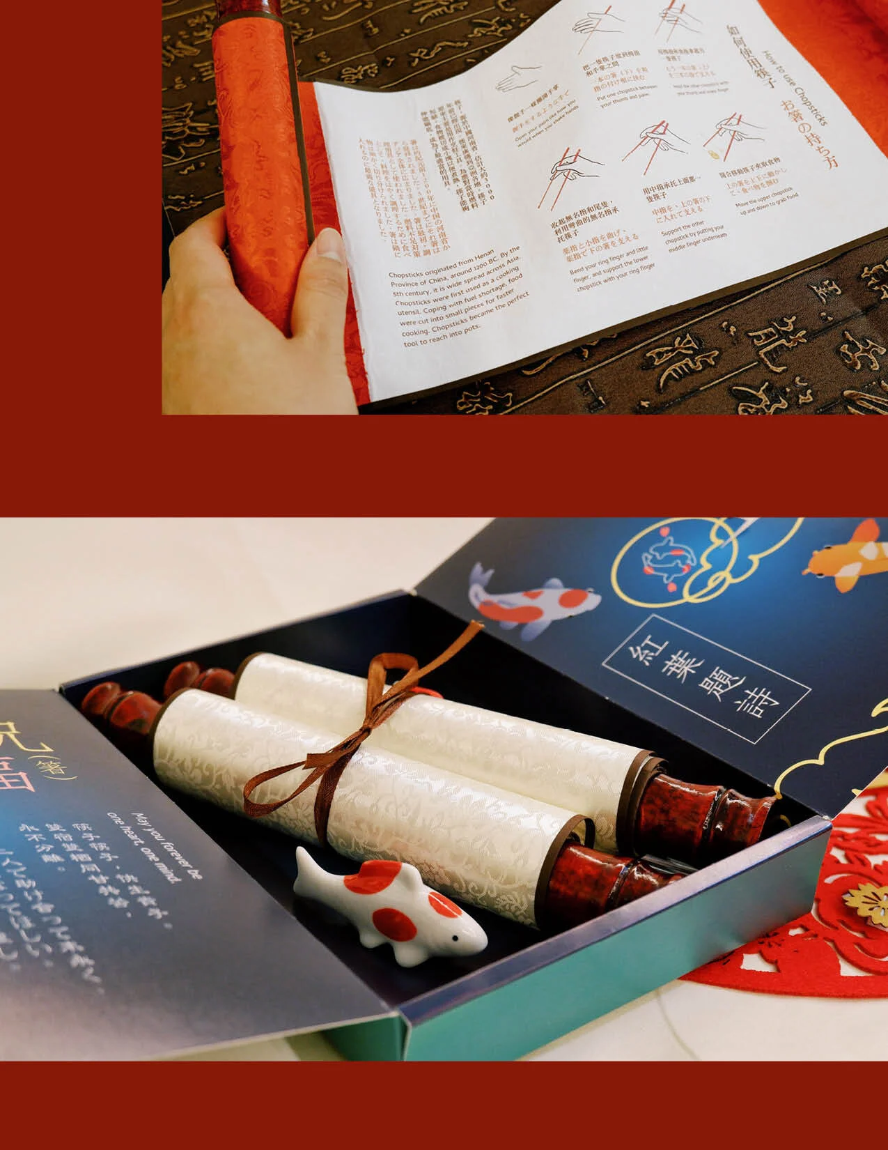 為了使此包裝更加貼合主題, 設計上選用了很多有關的圖像。錦鯉用于品牌標誌和包裝上的裝飾圖案,代表著好運的同時展現了陰陽符號的特質,延續了包裝蓋子的造型。此外,紅白色的錦鯉也是愛情和婚姻的象徵。品牌名字紅葉題詩來源於一首講述良緣的唐詩,現在也用作恭賀新人的賀詞, 有著詩情畫意的内涵。包裝上的蓮花和櫻花分別代表了中華和日本文化, 送禮者也可以根據喜好選取適合的包裝。包裝不僅融匯了歷史悠久且多樣的文化, 還具有收藏價值。取出包裝裡的筷子後,可以將其作為相框,擺放照片以留作紀念。