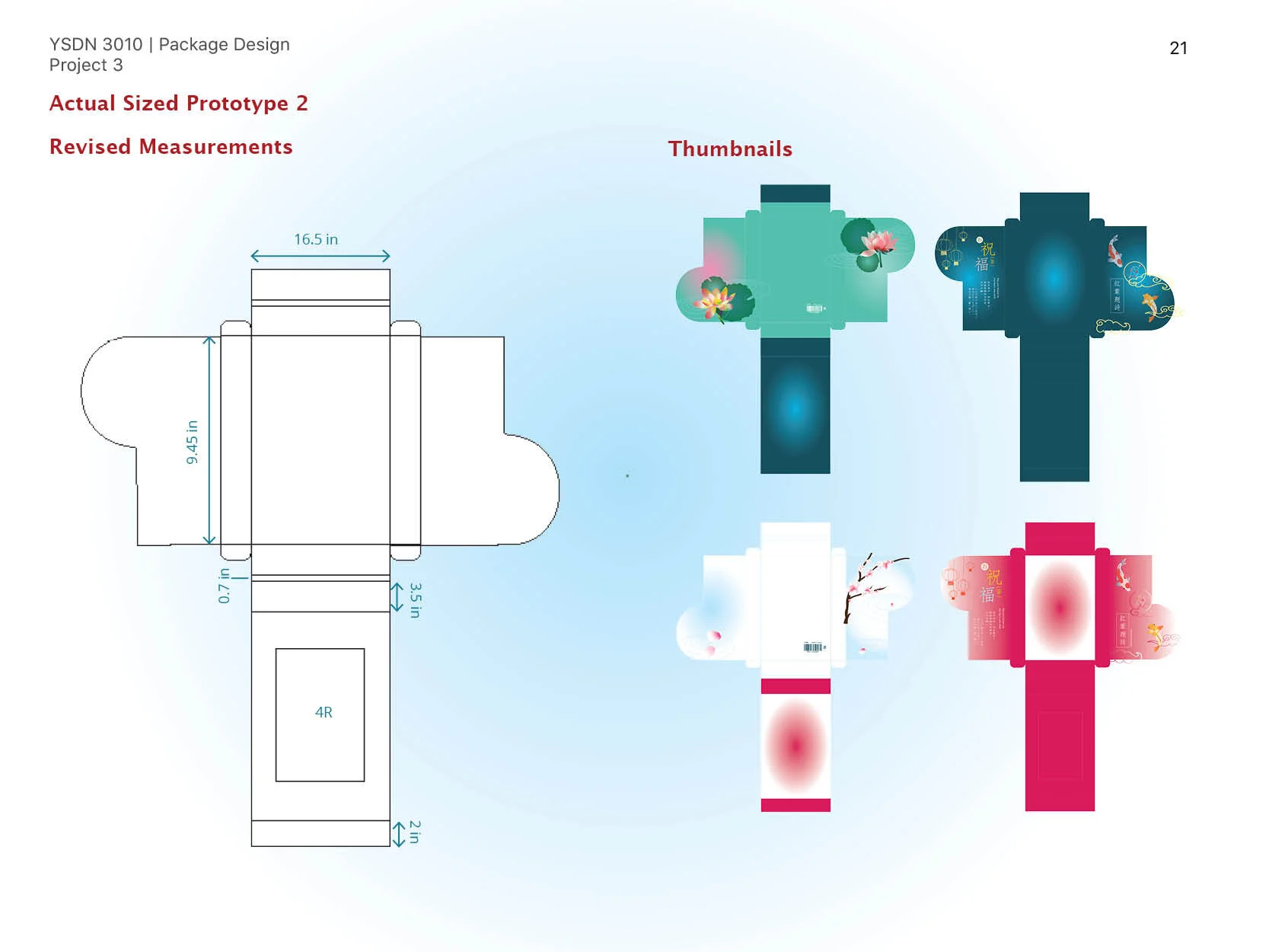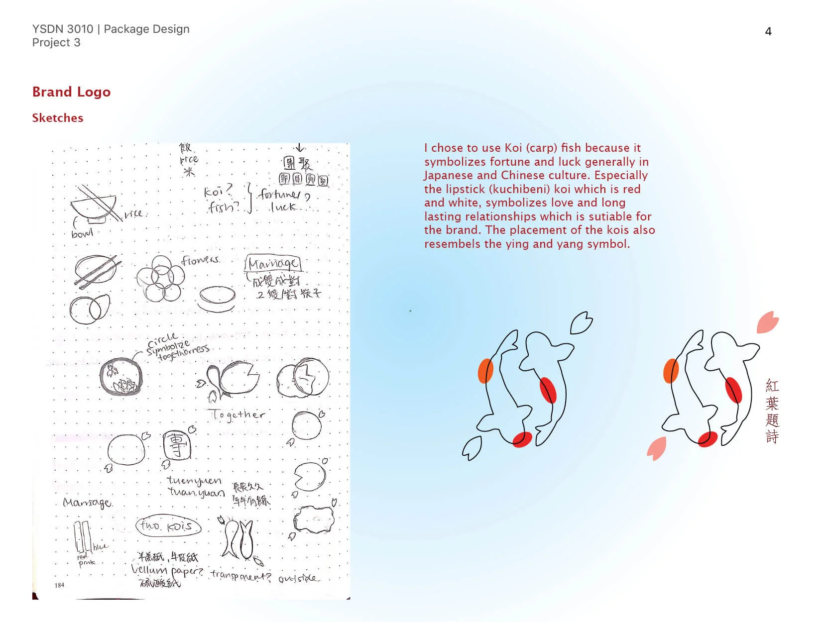 このようなコンセプトに合わせるため、デザインにおいて伝統的なシンボルを多数用 い、ロゴや包装のデザインには 鯉を使用した。理由としては、鯉は好運を象徴し、陰陽文化の特徴も持っている。また、紅白色 (口紅)の鯉は愛情や婚姻の象徴である。ブランド名の「紅葉題詩」は良縁を語った唐詩から由来し、今は新婚夫婦を祝福する言葉として使われ 、詩のような美しさがある。蓮の花や桜はそれぞれ中華文化や日本文化を象徴する。プレゼントを選ぶ際、個人の好みによって適切なパッケージを選ぶことが可能である。