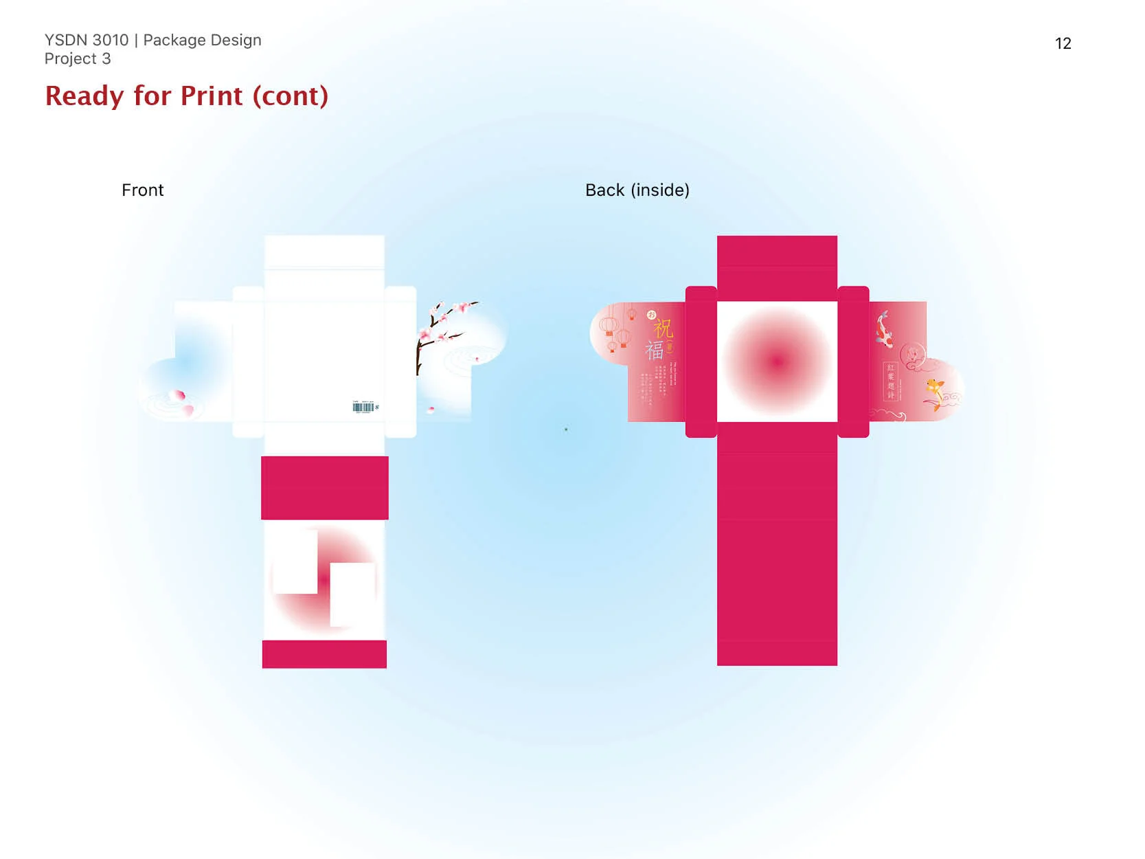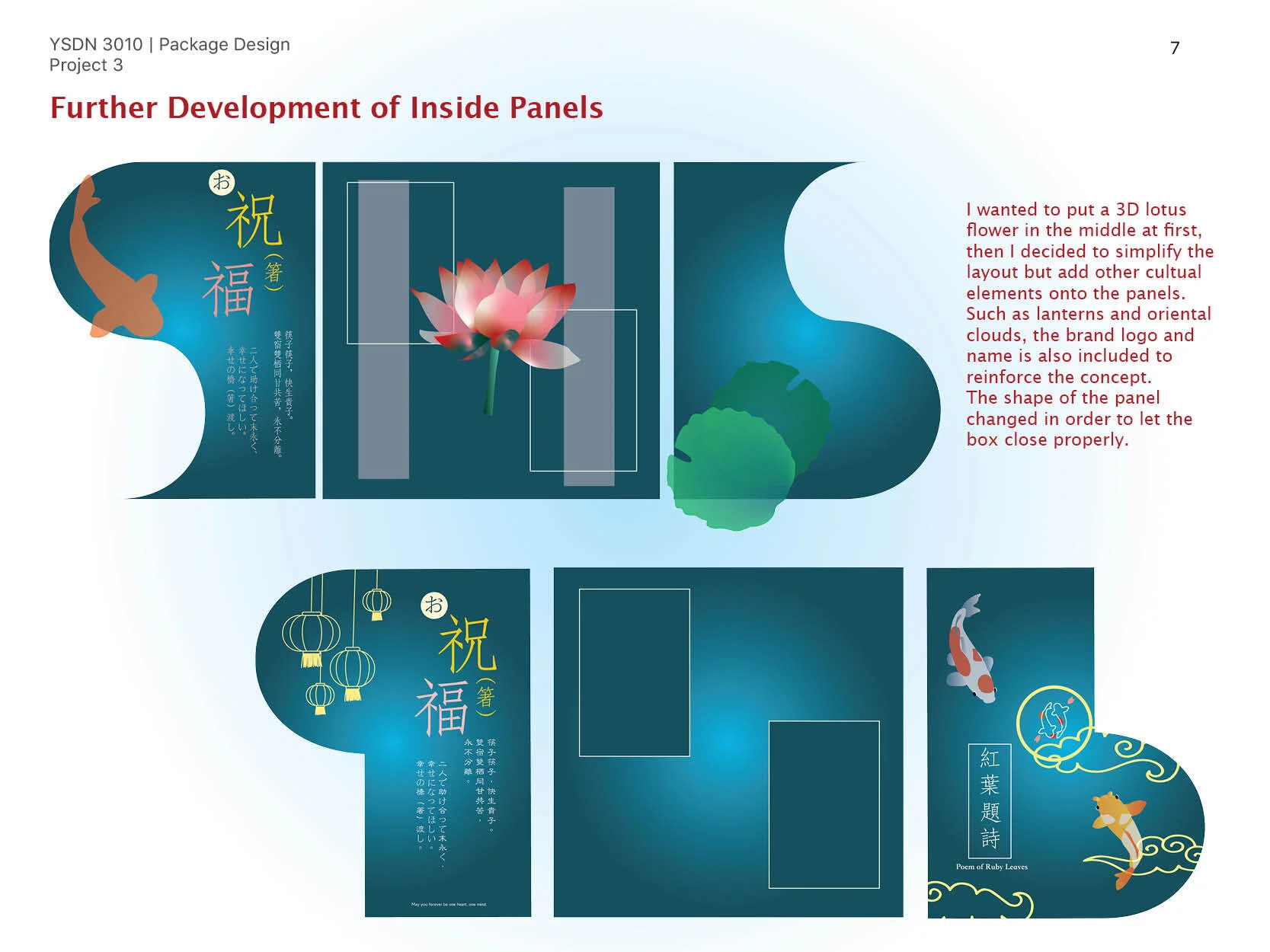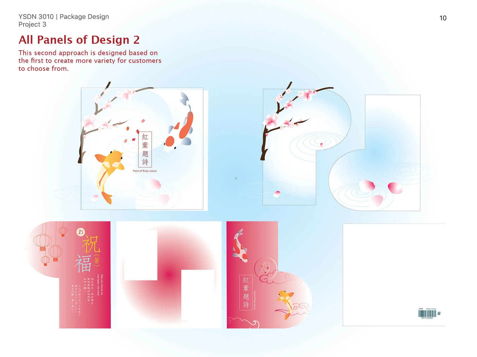 Having these concepts in mind, many traditional symbols have been added into the design. Koi fish (carp) is used as the logo and graphics, as it represents good fortune in both cultures; the logo with two koi fish resembles the ying and yang symbol that is also carried out on the cover design of the actual box. In addition, the lipstick (kuchibeni) koi which is red and white symbolizes love and marriage. The brand name Poem of Ruby Leaves (紅葉題詩) came from an ancient Chinese love tale and now is used as a greeting for weddings. Lotus flowers and cherry blossoms are used to represent Chinese and Japanese culture. Last but not least, the box is designed to be reused as a photo frame after the product has been taken out. (special thanks to the wedding illustration to demonstrate the photo frame effect by QianKuWang)